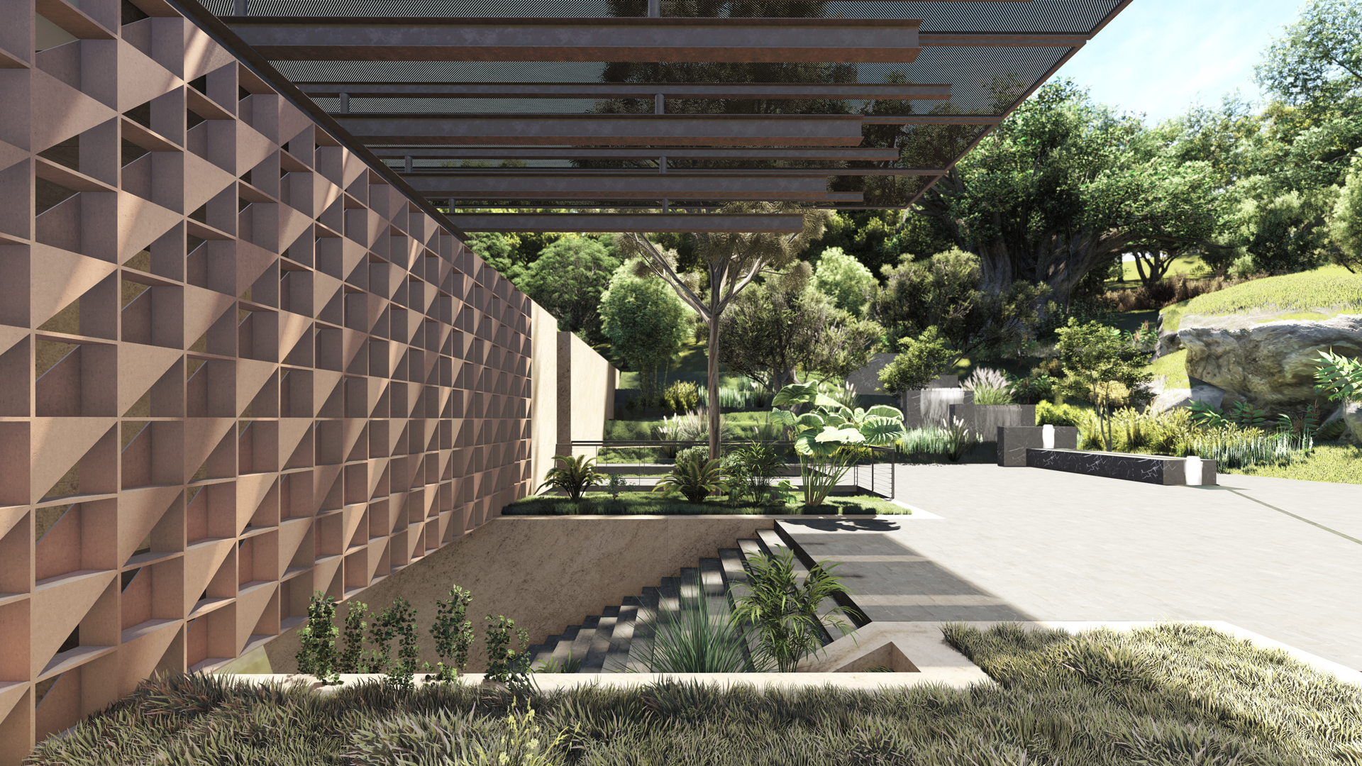 The project, which addresses the need to represent Italy in Nairobi, searches for architectural signs characteristic of Italian culture in its formal expression, aiming for integration and respect for the local landscape and culture. The project develops along squares connected by staircases, referencing the concept of a belvedere. The buildings that define these spaces relate to the context with two approaches: a closed and compact front towards the outside, conveying the idea of strength, and a permeable system inward, structured with the design of screened passages that draw inspiration from the idea of walkways under arcades.