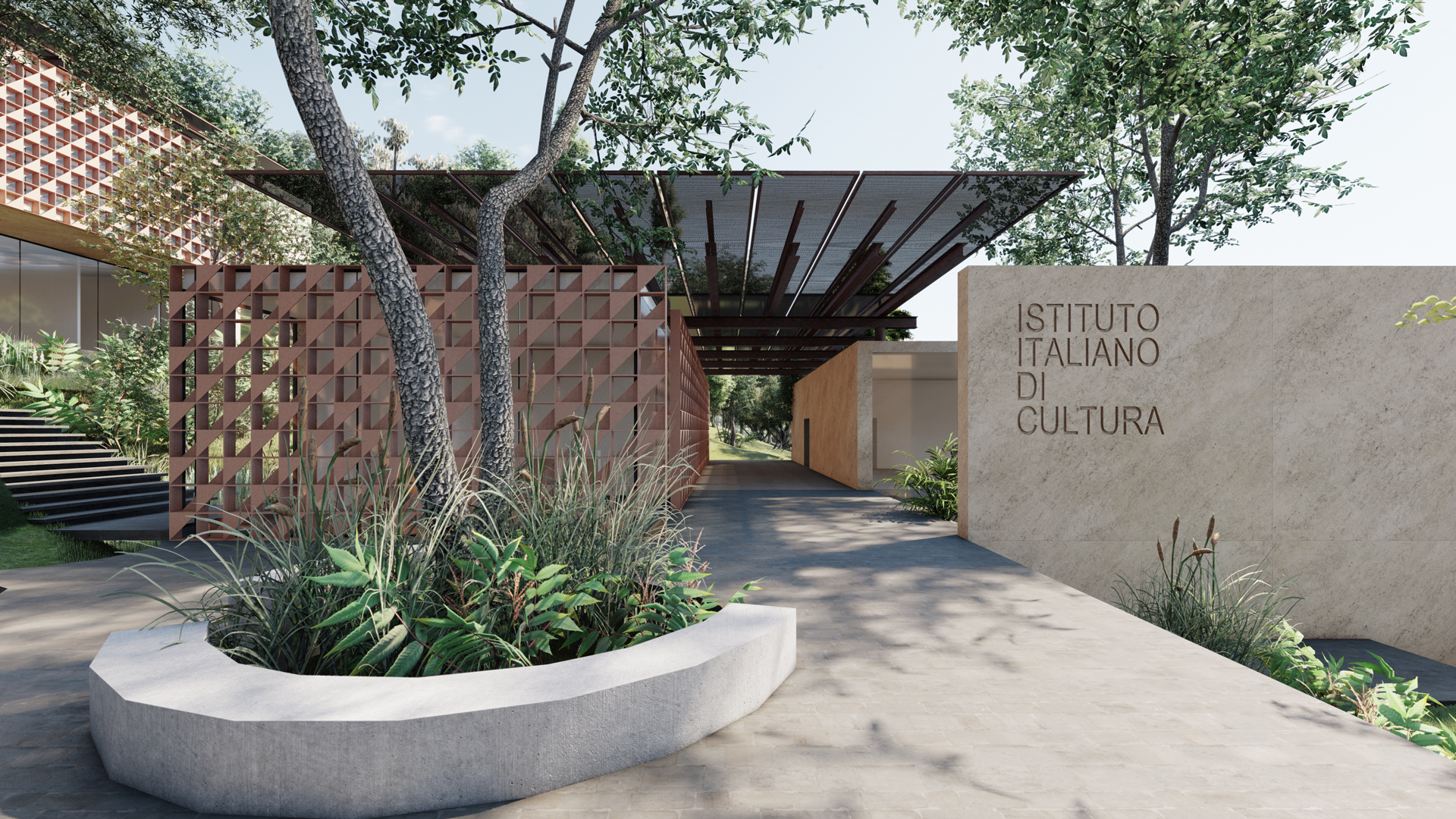 • Italian Institute of Culture: divided into two parts, it houses offices on one side, with dedicated employee access, and on the other, it hosts the auditorium and classrooms. The two areas are separated and joined by an external shaded space which, together with the internal garden, can host events that may also take place on the public access square.