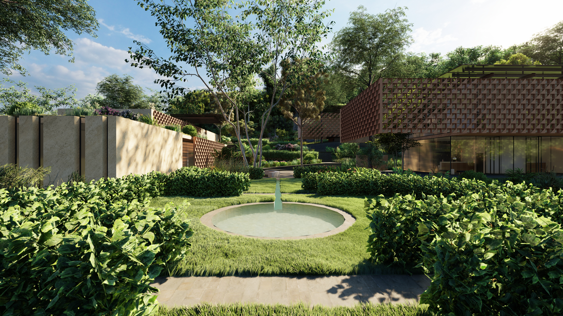 • Access control building: straddling the boundary, it is divided into two parts: one dedicated to the control of employees and another, positioned at a lower level, dedicated to external visitors. The difference in levels is used to divide the paths, transforming the entrance to the complex by external visitors into an emotional experience.