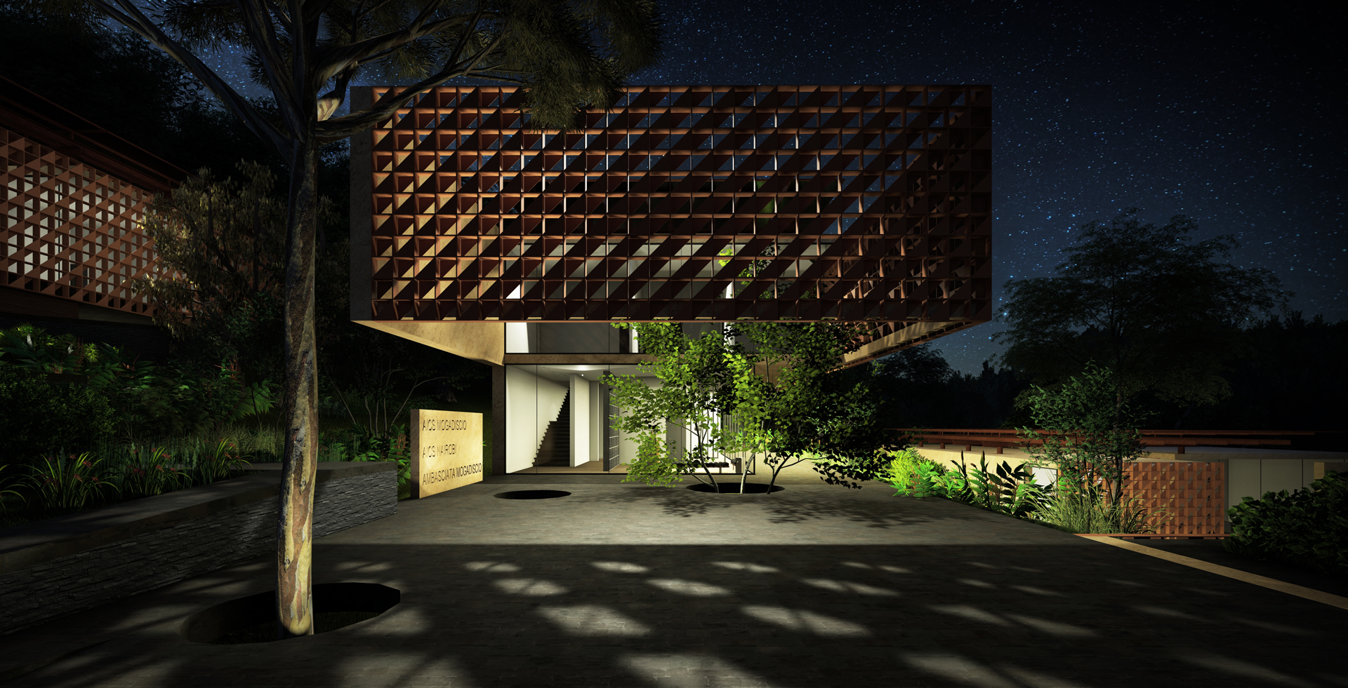 • Edificio AICS Nairobi, Mogadiscio e uffici Ambasciata Mogadiscio: l’ambasciata di Mogadiscio è separata dal resto dell’edificio e posizionata al livello della “piazza dell’arte”, gli uffici di cooperazione sono posizionati al piano superiore, l’ingresso è in comune al livello terra.